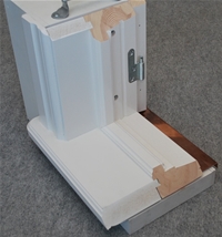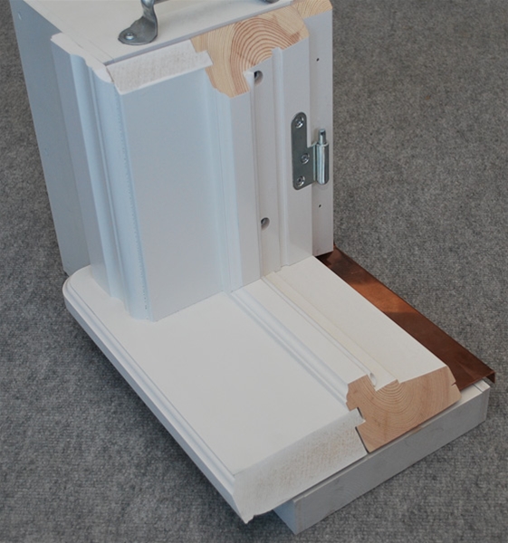 Bilden visar i genomskärning uppbyggnaden av karmen med spåret och smygen som sticks in och sluter tätt. Risken för framtida "springor" blir obefintlig. På smygen fräser vi en rundning inåt och fönsterbänken med en allmogeprofil och rundade hörn. Spåret och smygen beställs som tillval.